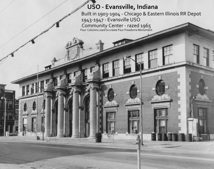 The Salvation Army set up their Mobile Canteen at Fifth & Main Streets in November, 1942. One month later the former C&EI RR Depot became the Main Street USO. The city received a grant of $63,000 to renovate the former railroad depot; rent was $200 per month.