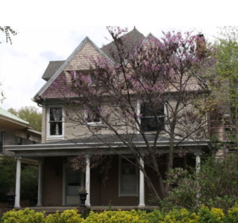 Twin, shingled gables with columns flanking recessed diamond-paned windows give interest to this two-story weather boarded residence built in 1895 for Edwin Taylor. The house joined a dozen others built between 1890 and 1896 that shaped the Upper Second Street residential neighborhood.