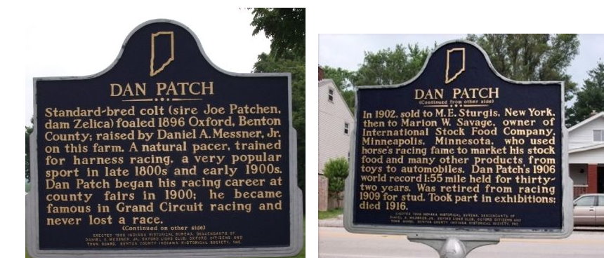 Born in Oxford, Indiana, in 1896 to the mare Zelica, owned by local storekeeper Daniel Messner Jr., Dan Patch (named by combining the first name of his owner with a shortened form of the last name of his sire, Joe Patchen) typified the classic American rags-to-riches tale. At birth his legs were so crooked that he required human assistance to stand up and nurse. Some of Messner's neighbors suggested that the horse be put out of its misery. Most of the townspeople called the colt "Messner's Folly." (Ten years later, these same naysayers bragged about their firsthand knowledge of this wonder horse.)